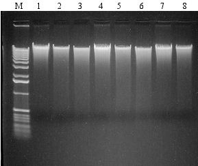 Total genomic DNA was isolated from 8 different soil samples using the PowerMax® Soil DNA Isolation Kit. 0.75 ¦Ìg of each isolated DNA was analyzed on 1 % TAE agarose gel and ethidium stained. M = Marker DNA. Soil types are identified in the table below.