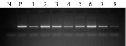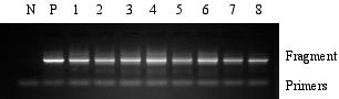 One microliter of total genomic DNA isolated using the PowerMax® Soil DNA Isolation Kit was PCR amplified using primers to the Bacillus spp. Amplified DNA was analyzed on 0.8% TAE agarose and ethidium stained. The amount of PCR fragment produced in each sample is representative of the relative amount of the template sequence in the purified DNA. Different soil sources will have different types and amount of organisms providing genomic DNA. N = Negative control lacking template. P = Positive control template. Soil types and amount are identified in the table below.